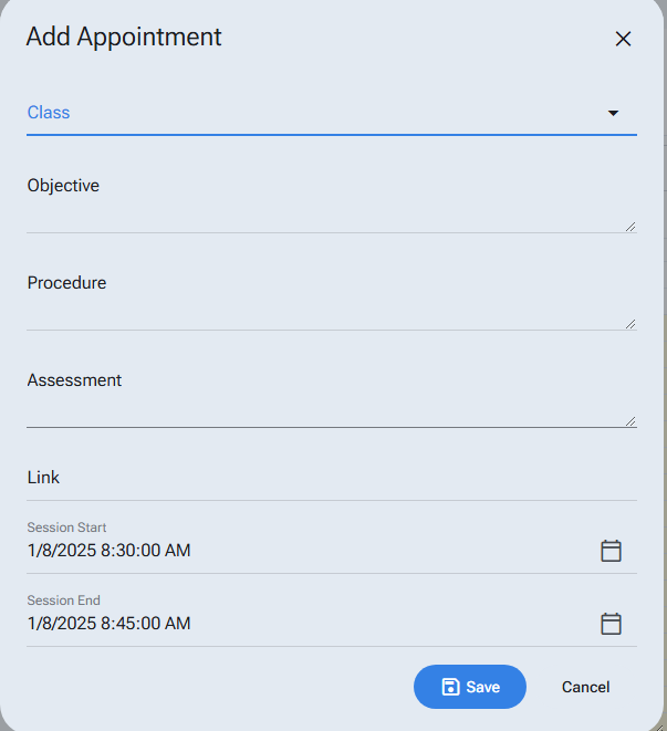 Click on an empty calendar slot to create a class session.