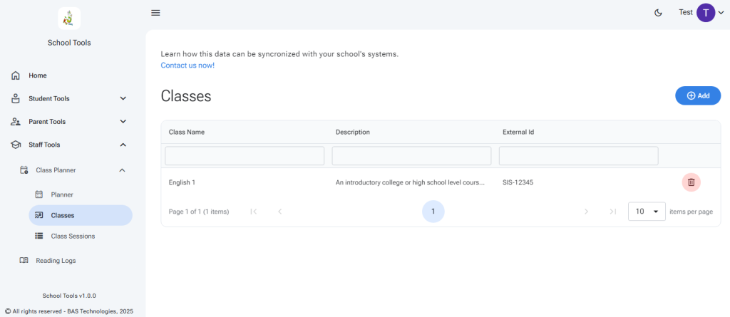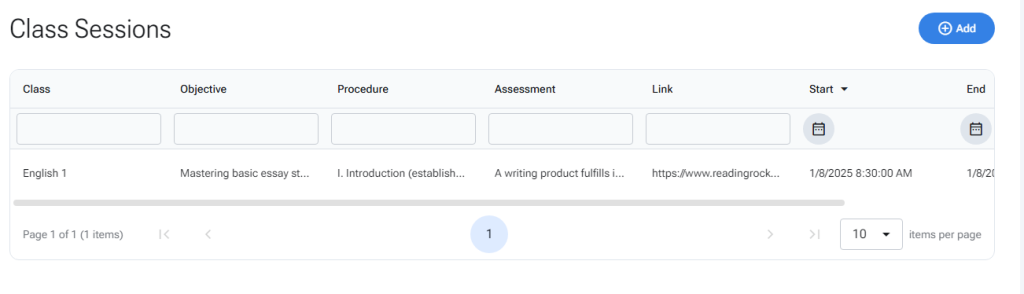 Add, review, edit, and delete classes or class sessions in the tabular views.