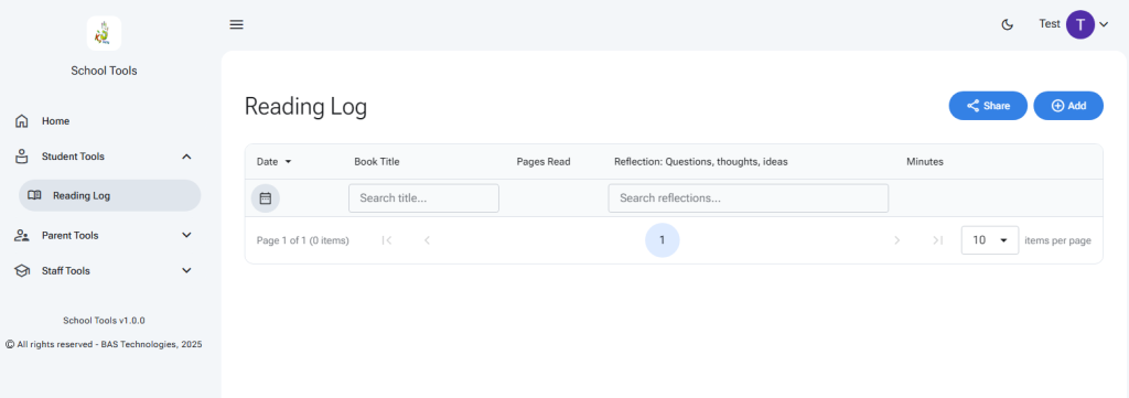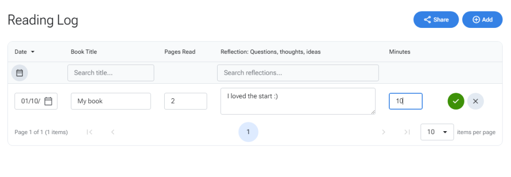 Select ‘Add’ in the Student Tools Reading Log page. A new line will be created, add your details and select the check button to save.