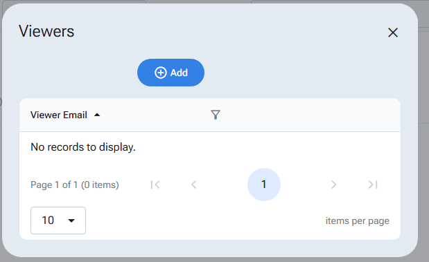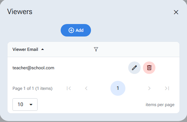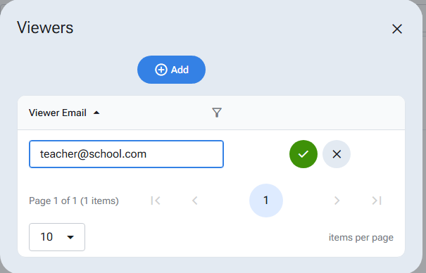 To allow other users to see your reading log, select the share button to bring up the viewers dialog. Here you will see existing user emails with access to your reading log. Select the ‘Add’ button to add new viewers.